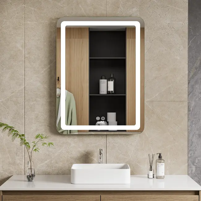 Deze stijlvolle badkamerspiegel is een ideale toevoeging voor elke moderne badkamer. De spiegel heeft een frameloos design met afgeronde hoeken, wat ervoor zorgt dat deze naadloos past in elk interieur, of het nu klassiek of eigentijds is.