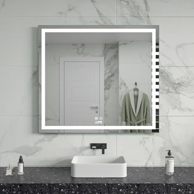 De spiegel is voorzien van een naadloos geïntegreerde LED-rand die zowel als hoofdverlichting als sfeerverlichting kan worden ingesteld. De verlichting is in drie verschillende kleuren instelbaar: warm wit (3000K), natuurlijk wit (4000K) en daglicht wit (6000K), zodat je altijd de juiste sfeer kunt creëren. Ook de lichtsterkte is naar wens aan te passen in stappen van 10%. Bovendien heeft de spiegel een ingebouwde anti-condens verwarmingsfunctie, zodat je altijd een heldere spiegel hebt, zelfs in een vochtige badkamer.