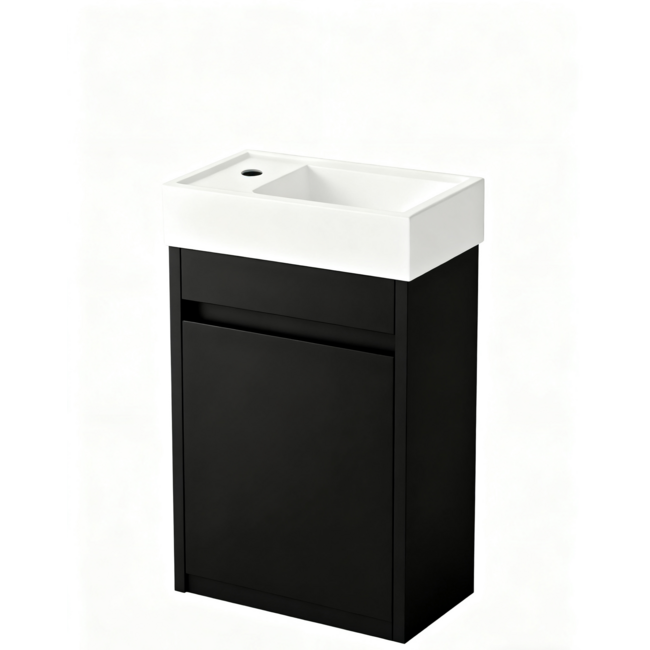 De kast heeft een afmeting van 41 x 22,5 x 56 cm en biedt handige opbergruimte voor toiletartikelen. De keramische basin meet 41 x 22,5 x 9 cm, waardoor de totale hoogte van het meubel uitkomt op 65 cm. Perfect voor kleine toiletruimtes of compacte badkamers.